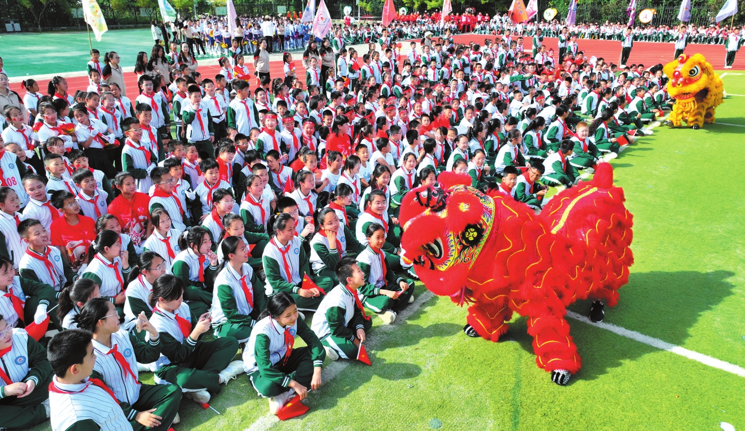9月28日,忻州市長(zhǎng)征小學(xué)西校區(qū)舉行第二屆秋季田徑運(yùn)動(dòng)會(huì)。圖為開幕式上孩子們與“獅”互動(dòng)。(記者 張存良攝)