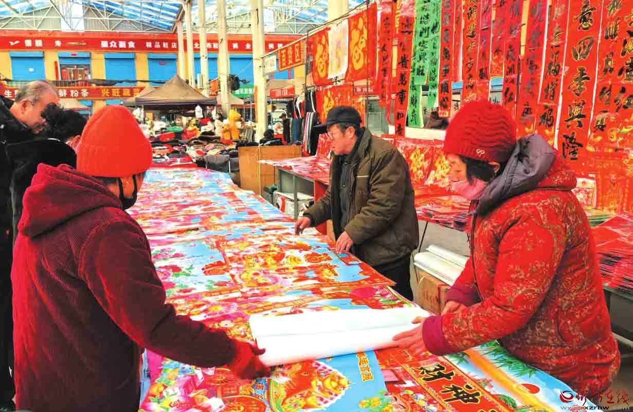 春節(jié)臨近,神池縣集貿(mào)市場迎來購銷兩旺的高峰期,處處洋溢著喜慶祥和的節(jié)日氛圍。圖為春聯(lián)年畫攤位前,市民正在精心挑選心儀的年貨。(鄭志東 攝