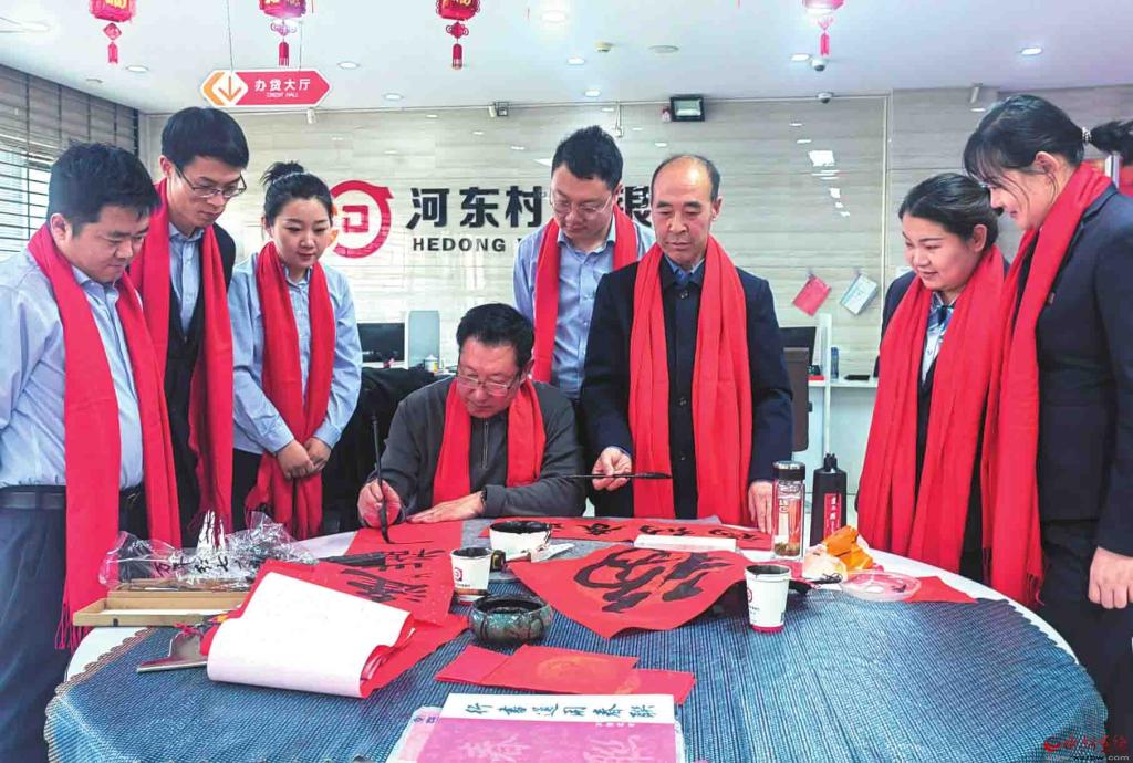 新春到來之際,神池縣河?xùn)|村鎮(zhèn)銀行邀請(qǐng)當(dāng)?shù)貢◥酆谜咴跔I(yíng)業(yè)大廳現(xiàn)場(chǎng)揮毫潑墨,為前來辦理業(yè)務(wù)的客戶書寫春聯(lián),深受群眾稱贊。(楊晉明攝