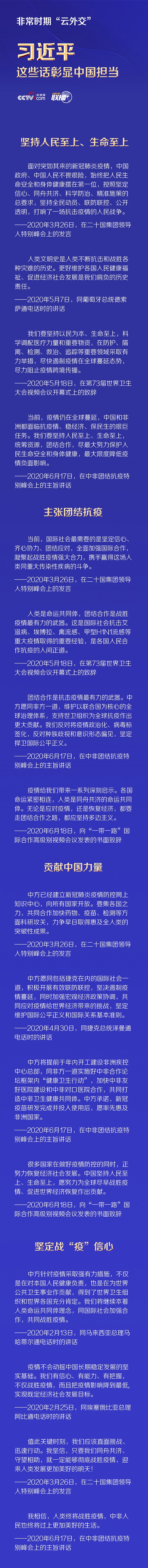 截至目前,習(xí)近平主席已經(jīng)同數(shù)十位外國(guó)領(lǐng)導(dǎo)人及國(guó)際組織負(fù)責(zé)人通話或見(jiàn)面,出席二十國(guó)集團(tuán)領(lǐng)導(dǎo)人應(yīng)對(duì)新冠肺炎特別峰會(huì),在第73屆世界衛(wèi)生大會(huì)視頻會(huì)議開(kāi)幕式上致辭,主持中非團(tuán)結(jié)抗疫特別峰會(huì)并發(fā)表主旨講話等,開(kāi)啟了以電話、書信、視頻為主渠道的“云外交”模式。