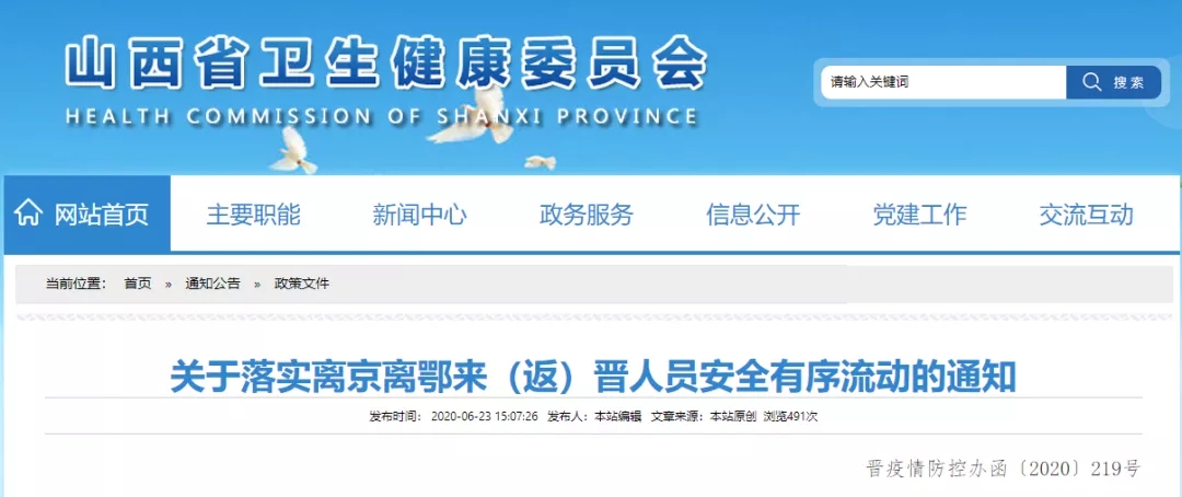 根據(jù)《關(guān)于做好離京人員新冠肺炎健康管理服務(wù)工作的通知》(聯(lián)防聯(lián)控機制綜發(fā)〔2020〕198號)要求和兄弟省市對離鄂人員的共同做法,現(xiàn)就落實離京離鄂來(返)晉人員安全有序流動通知如下:
