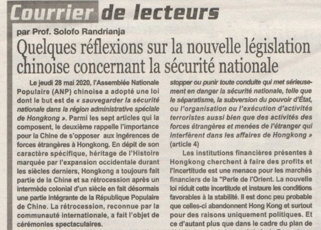 近日,馬達(dá)加斯加政治研究學(xué)院、塔馬塔夫大學(xué)教授蘇魯夫先生在馬達(dá)加斯加主流報紙上發(fā)表文章《關(guān)于對中國涉港國家安全立法的幾點思考》。