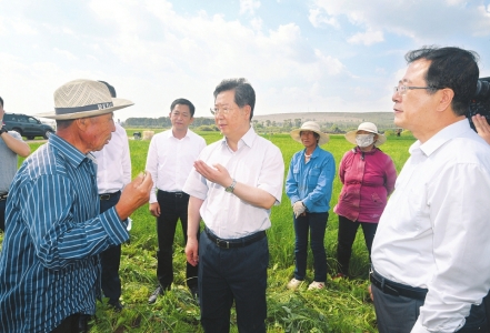 七月十三日,在右玉縣威遠鎮(zhèn)小香蔥種植基地,省委書記樓陽生向農(nóng)戶了解產(chǎn)業(yè)帶動增收情況。山西日報記者李聯(lián)軍攝