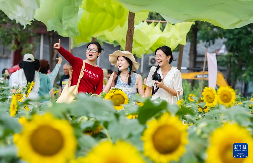 8月12日,游客在河南省駐馬店市西平縣老王坡產(chǎn)業(yè)融合發(fā)展示范區(qū)的百畝油葵花海游玩。(新華社發(fā) 趙永濤 攝)