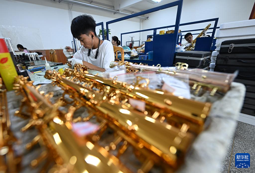 8月13日,在天津圣樂樂器有限公司,工作人員在生產車間裝配樂器。(新華社記者 趙子碩 攝)