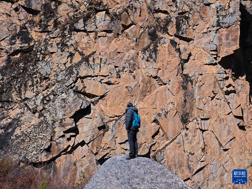 10月21日,陳雪松在實(shí)地調(diào)查海子山老林溝拉托扎巖畫。該處巖畫位于海子山南側(cè)老林溝內(nèi),巖畫由小型鹿圖案、三角形以及X型符號(hào)組成。(新華社記者 薛晨 攝)