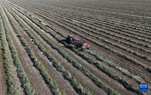 11月1日,工人駕駛拖拉機(jī)在甘肅山丹馬場二場田間翻曬燕麥草(無人機(jī)照片)。(新華社發(fā) 陳禮 攝)