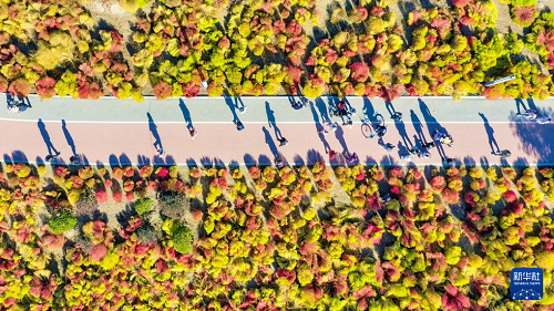 11月2日,游人在天津市濱海新區(qū)的白鷺洲公園賞秋游玩。(新華社發(fā) 杜鵬輝 攝)