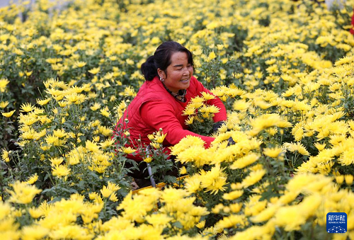 11月5日,甘肅省定西市臨洮縣康家集鄉(xiāng)的村民在采摘金絲皇菊。(新華社發(fā) 王克賢 攝)