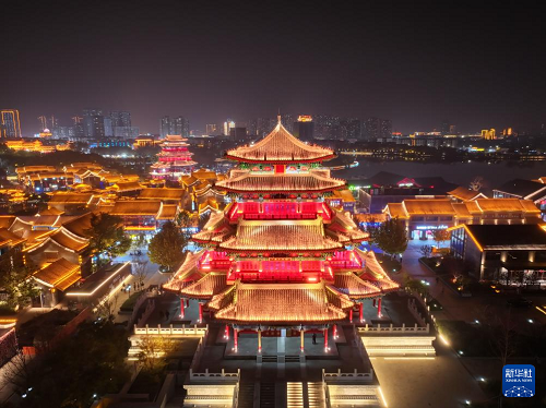 京杭大運河滄州段沿線建筑燈光璀璨(11月11日攝,無人機照片)。(新華社記者 牟宇 攝)