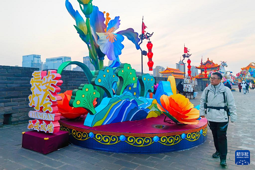 2026年1月4日,趙彬在西安城墻新年燈會期間帶著城墻外骨骼機(jī)器人巡查。新華社發(fā)