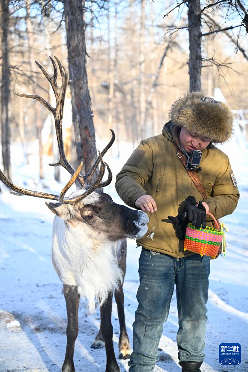 1月15日,游客在根河市敖魯古雅鄂溫克民族鄉(xiāng)敖魯古雅使鹿部落景區(qū)與馴鹿互動。(新華社記者 徐嘉懿 攝)