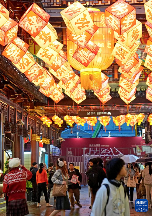 1月26日,豫園燈會(huì)上的春聯(lián)與流光溢彩的花燈營造出新春的喜慶氛圍。(新華社記者 劉穎 攝)