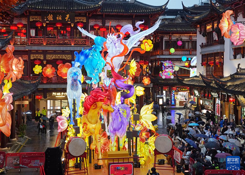 1月26日,在豫園商城中心廣場上,游客在馬年主題燈組“駿馳九州,步步生花”前駐足。(新華社記者 劉穎 攝)