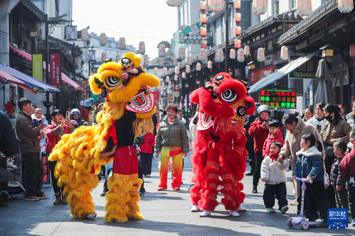 2月8日,游客在壽昌古鎮(zhèn)老街上觀看傳統(tǒng)舞獅表演。(新華社記者 徐昱 攝)
