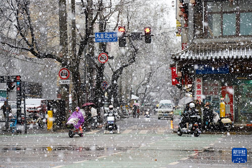 2月23日,在陜西省西安市街頭,市民冒雪出行。(新華社發(fā) 薛剛 攝)