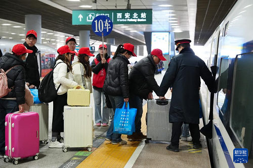 2月24日,來自西安市周至縣的務(wù)工人員前往西安北站站臺。(新華社記者 邵瑞 攝)