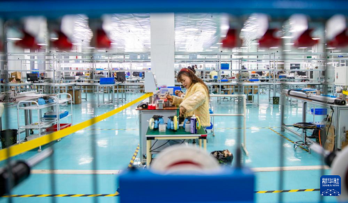 2月24日,在位于河南省商丘市睢縣高新技術產(chǎn)業(yè)開發(fā)區(qū)的商丘中軒電子科技有限公司電子線束生產(chǎn)車間內(nèi),工人趕制電子排線外貿(mào)訂單。(新華社發(fā) 徐澤源 攝)