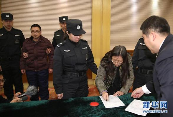 2月6日,在北京首都機(jī)場(chǎng),檢察官向“百名紅通”嫌犯付耀波(右五)、張清曌(右二)宣讀相關(guān)法律文書。當(dāng)日,在中央追逃辦統(tǒng)一部署下,在外交部、公安部及我駐巴巴多斯、格林納達(dá)等駐外使館的大力協(xié)助下,遼寧省追逃辦組織協(xié)調(diào)檢察、公安等部門,成功將遠(yuǎn)逃至加勒比海島國(guó)圣文森特和格林納丁斯的“百名紅通”第39號(hào)嫌犯付耀波、第41號(hào)嫌犯張清曌同時(shí)抓獲歸案。新華社記者殷剛攝