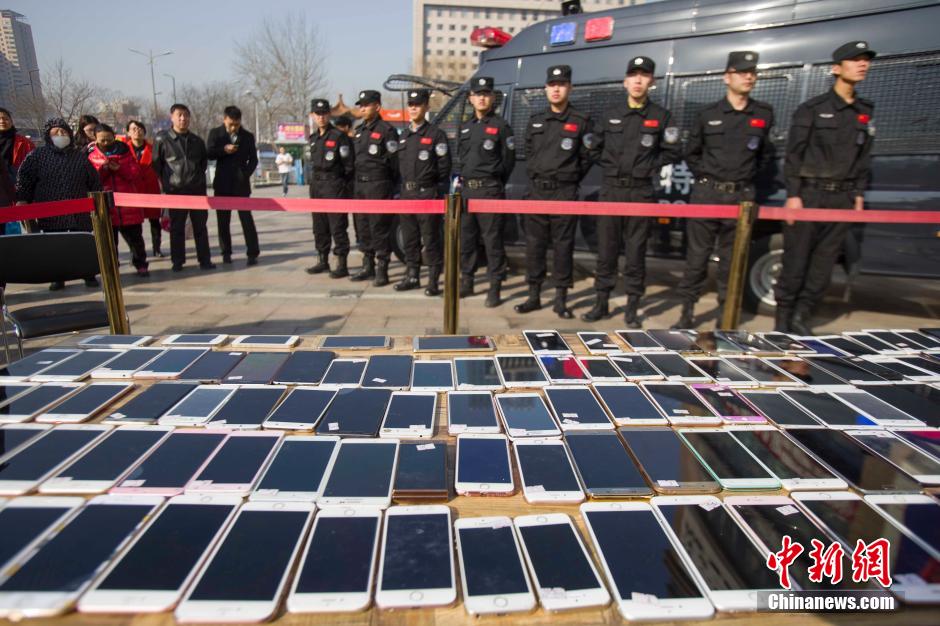 3月2日,山西太原警方發(fā)還民眾被盜手機(jī)。近日,太原市公安局偵破一個手機(jī)扒竊犯罪團(tuán)伙,破獲案件200余起,追繳手機(jī)180余部。張云 攝
