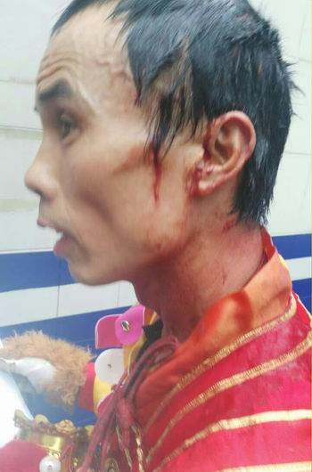 當(dāng)日下午,“猴王”打架一事就是因?yàn)闋?zhēng)地盤而起。其中一名老“猴王”被一名年輕“猴王”用金箍棒打傷了左側(cè)頭部,鮮血直流。最后,經(jīng)過警方的協(xié)調(diào),雙方達(dá)成一致。打人者賠償被打者1500元醫(yī)藥費(fèi)。(圖片由警方提供)