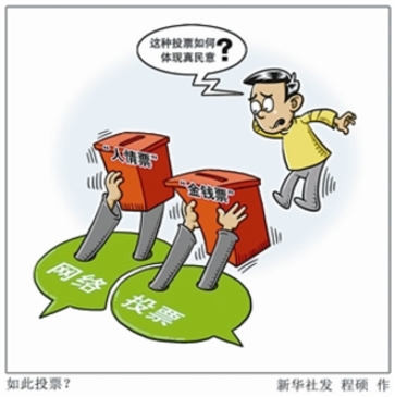 從紅遍大江南北的超女、快男開(kāi)始,各種評(píng)選活動(dòng)日益增多,最萌寶貝、最美司機(jī)、最美景點(diǎn)等等,你方唱罷我登場(chǎng),好不熱鬧。投票手段也不斷演進(jìn),手機(jī)短信、網(wǎng)絡(luò)海選、朋友圈投票等,花樣翻新、不一而足。投票方式雖與時(shí)俱進(jìn),衡量投票結(jié)果的標(biāo)準(zhǔn)卻未變,票數(shù)多少固化為讓各方“信服”的指標(biāo),如何獲得票數(shù)則一概不論。
