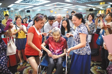 2016年7月9日,重慶雙百歲老人夫妻過(guò)生日,子女們特意為他們?cè)诮夥疟宥季频昱e辦了一場(chǎng)雙百盛典。圖/視覺中國(guó)