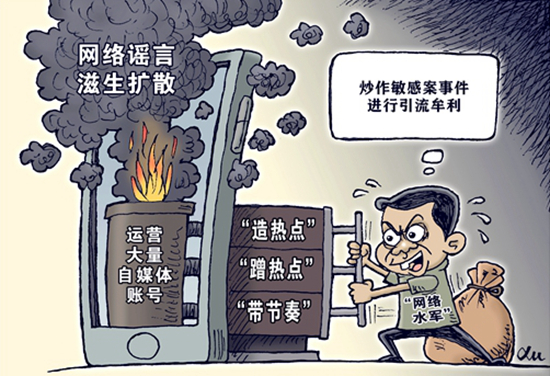 編造傳播虛假信息“造熱點”“蹭熱點”“帶節(jié)奏”,炒作敏感案事件進行引流牟利,開設(shè)假冒媒體網(wǎng)站和自媒體賬號,打著“輿論監(jiān)督”等旗號,實施敲詐勒索……這些行為被公安機關(guān)嚴(yán)厲打擊。徐駿/作(新華社發(fā))