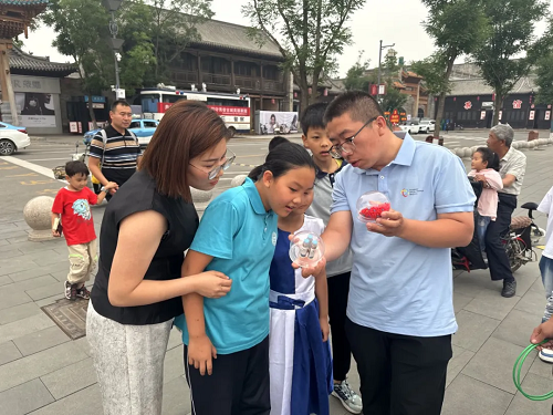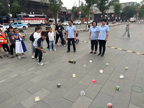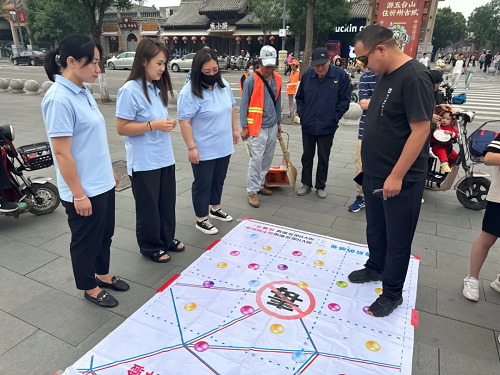 活動現場,在一個特殊的攤位上,由近到遠分別擺放著“冰毒”“海洛因”“搖頭丸”等各種眼花繚亂的毒品仿真模型?!皝韥韥恚哌^路過不要錯過!”“瞧一瞧,看一看!”禁毒社工在“攤位”前賣力吆喝著,一陣陣吆喝聲引來了眾多游客,游戲通過套圈的方式,組織游客套中現場的毒品模型并準確說出毒品名稱即可獲得扇子、手機支架、帆布包等獎勵。