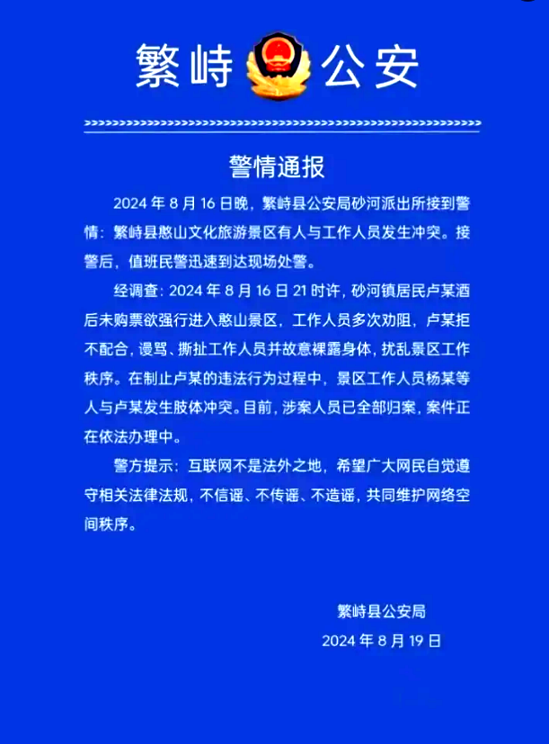 經(jīng)調(diào)查:2024年8月16日21時(shí)許,砂河鎮(zhèn)居民盧某酒后未購票欲強(qiáng)行進(jìn)入憨山景區(qū),工作人員多次勸阻,盧某拒不配合,謾罵、撕扯工作人員并故意裸露身體,擾亂景區(qū)工作秩序。在制止盧某的違法行為過程中,景區(qū)工作人員楊某等人與盧某發(fā)生肢體沖突。目前,涉案人員已全部歸案,案件正在依法辦理中。