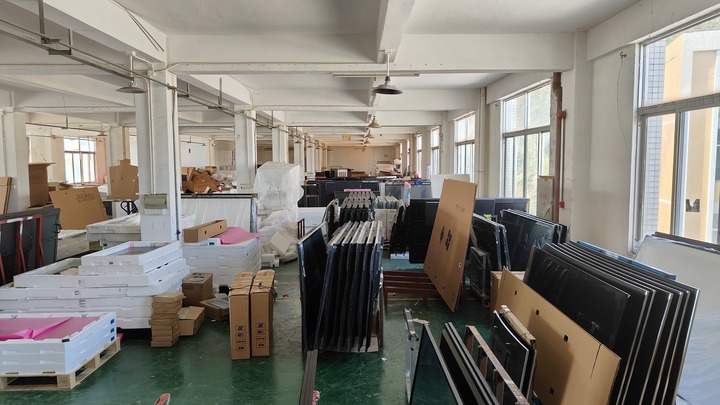 專案組查處違法組裝電視機的車間時發(fā)現(xiàn),庫房內(nèi)堆積著大量電視機外殼、主板和白板顯示屏,還有很多品牌透明貼紙,以及部分準備發(fā)出和退回的假冒品牌電視機。
