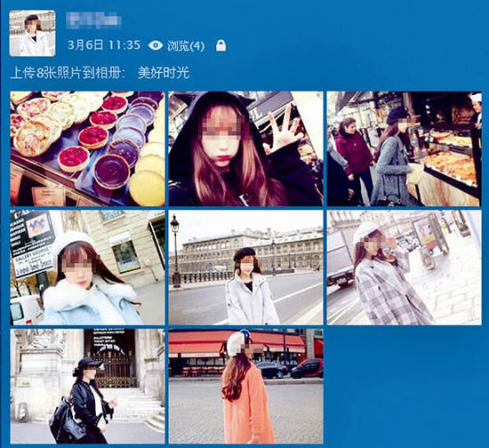 “最好找粉絲在10萬以下的網(wǎng)紅。”在微博上,魏強嫻熟地搜到一個名為“Panny”的模特,點擊其關(guān)注的好友,找到類似幾名網(wǎng)紅,讓記者下載她們的照片,用修圖軟件清除圖片上的水印,再上傳到QQ空間。魏強在QQ上假扮的“白富美”網(wǎng)名叫“Eiffel”,他還煞費苦心地更新“Eiffel”的QQ空間。