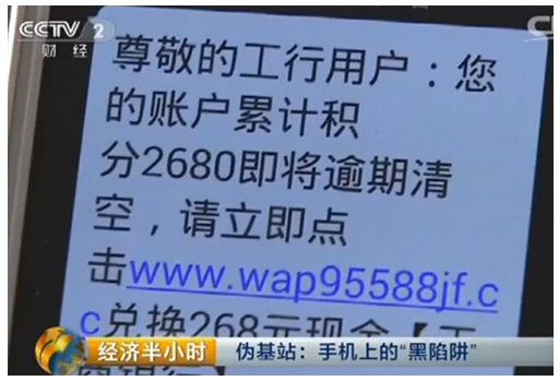 近日央視報道了湖北警方破獲的一系列短信詐騙案件。案件中,犯罪嫌疑人利用偽基站不定向向群眾發(fā)送冒充銀行的詐騙短信,通過發(fā)送有關(guān)積分兌換的信息騙取受害人的支付驗證碼,轉(zhuǎn)走受害人銀行卡內(nèi)的5000元錢。安全專家提醒,偽基站欺詐短信猖獗,已成近幾年對用戶財產(chǎn)危害最大的欺詐類型,用戶需注意防范。