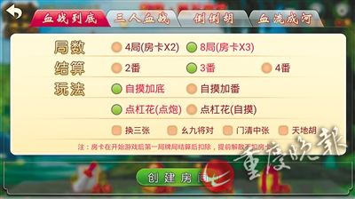 進(jìn)入游戲后,界面顯示“創(chuàng)建房間”和“加入房間”兩項。玩家創(chuàng)建房間時,可選擇局?jǐn)?shù)、玩法等具體設(shè)置,還能選“自摸加底”“自摸加番”“點杠花(點炮)”“點杠花(自摸)”“換三張”等,然后通過微信邀請好友加入牌局。接到邀請的玩家,輸入房間號后就能進(jìn)入牌局,通過手機(jī)聯(lián)網(wǎng)打麻將。