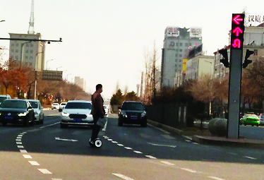一男子騎助力車橫穿馬路,危險!(王國棟 攝)
