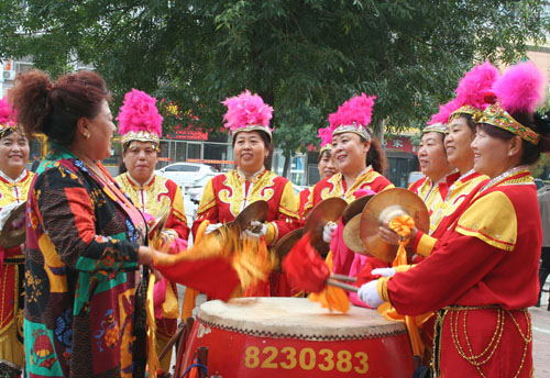 9月26日,原平市姐妹威風(fēng)鑼鼓隊(duì)的人員正在敲鑼打鼓慶豐收,進(jìn)入金秋以來(lái)。該市群眾們采取形式多樣豐富多彩的活動(dòng)來(lái)慶豐收。(趙春曉 攝)