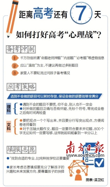 張敏強(qiáng)提醒,沖刺階段切勿盲目相信網(wǎng)上所謂的“內(nèi)部題”“必考題”,應(yīng)以“溫故”為主,不建議再做過(guò)多新題目。他提醒家長(zhǎng),考慮志愿填報(bào)要充分了解孩子的興趣和未來(lái)發(fā)展方向,要尊重孩子的抉擇,“找到合適的專(zhuān)業(yè),比純粹挑學(xué)校還要重要。”