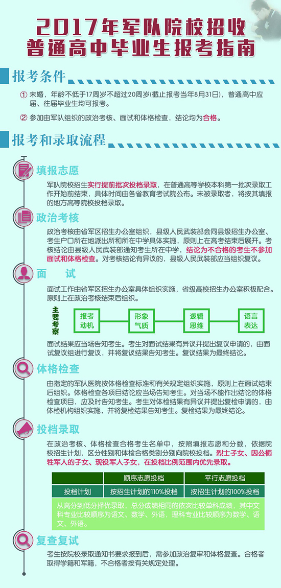 提醒考生和家長謹(jǐn)防詐騙行為。軍隊院校招收普通高中畢業(yè)生,依托全國高考體系,實行提前批次錄取,投檔錄取流程與地方普通高校招生完全一致,院校在投檔比例范圍內(nèi)對政審面試體檢均合格的考生,嚴(yán)格按照從高分到低分的順序進(jìn)行錄取,提前批次走完全部流程結(jié)束錄取后,軍隊院校招生工作也隨即結(jié)束。軍隊院校招收士兵學(xué)員,參照考生填報志愿從高分到低分依次錄取,錄取方案須經(jīng)軍委機(jī)關(guān)、軍兵種機(jī)關(guān)和招生院校業(yè)務(wù)部門三方簽字確認(rèn),并向考生公示。提醒考生和家長注意,謹(jǐn)防所謂“內(nèi)部指標(biāo)”“補錄”等招生詐騙行為。