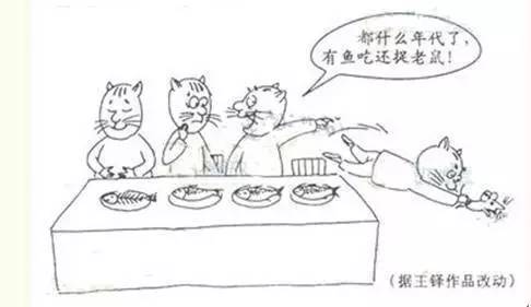 餐桌,許多貓吃魚,就一只貓捉老鼠,別的貓說:“有魚吃還捉老鼠?”