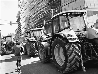 歐盟與俄羅斯之間的相互制裁導(dǎo)致歐盟成員國(guó)農(nóng)產(chǎn)品價(jià)格下跌,引發(fā)農(nóng)民不滿。圖為今年3月,比利時(shí)農(nóng)民將拖拉機(jī)開(kāi)上布魯塞爾的街道,進(jìn)行抗議示威。人民視覺(jué)