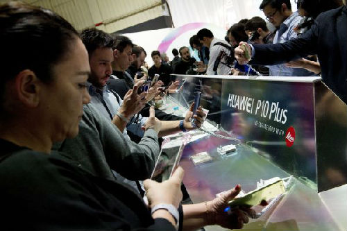 2月26日,在西班牙巴塞羅那舉行的世界移動通信大會開幕前,人們試用中國品牌華為新發(fā)布的P10和P10 Plus手機。(新華社)