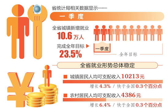 經(jīng)濟(jì)穩(wěn),就業(yè)穩(wěn),收入增。省統(tǒng)計(jì)局相關(guān)數(shù)據(jù)顯示,一季度,全省城鎮(zhèn)居民人均可支配收入10213元,增長4.3%,快于全國0.3個(gè)百分點(diǎn)。農(nóng)村居民人均可支配收入4386元,增長6.4%,快于全國0.3個(gè)百分點(diǎn)。