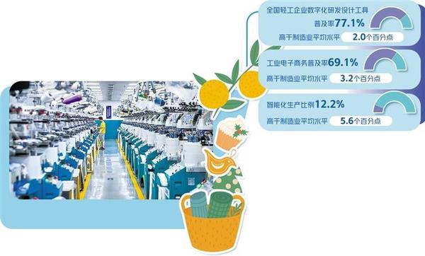 “以輕工業(yè)為例,全國輕工企業(yè)數(shù)字化研發(fā)設(shè)計(jì)工具普及率77.1%,工業(yè)電子商務(wù)普及率69.1%,分別高于制造業(yè)平均水平2.0個(gè)和3.2個(gè)百分點(diǎn)。”王孝洋說。