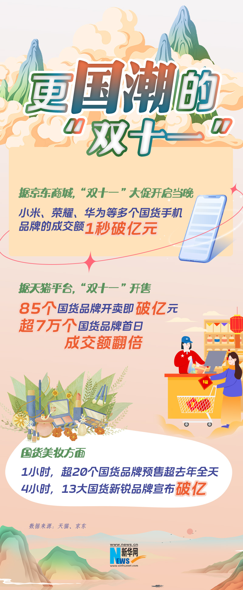公開數(shù)據(jù)顯示,10月23日京東“雙十一”開啟當晚,小米、榮耀、華為等多個國貨手機品牌的成交額1秒破億元;10月31日晚天貓“雙十一”正式開售,85個國貨品牌開賣即破億元,超7萬個國貨品牌首日成交額翻倍。