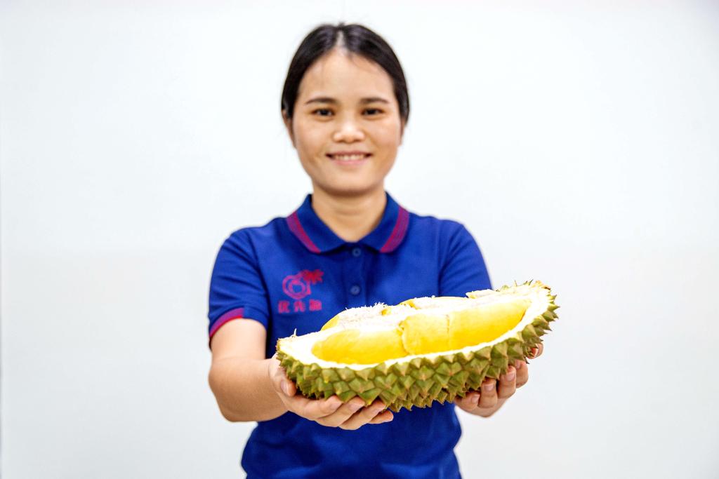 沙西通果園的榴蓮被采摘后,很快被運到附近一家加工廠。這里,工人們忙碌地對新鮮榴蓮進行分揀、稱重、打包、裝車。