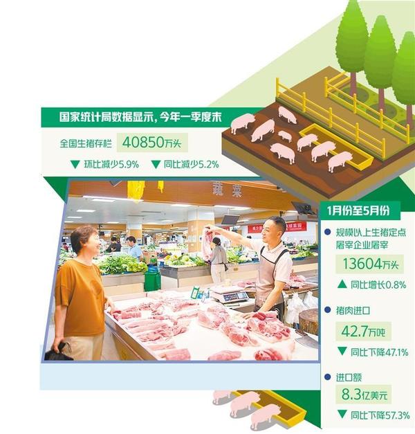 國(guó)家統(tǒng)計(jì)局?jǐn)?shù)據(jù)顯示,今年一季度末,全國(guó)生豬存欄40850萬(wàn)頭,環(huán)比減少5.9%,同比減少5.2%。一季度,全國(guó)生豬出欄19455萬(wàn)頭,同比下降2.2%;豬肉產(chǎn)量1583萬(wàn)噸,同比下降0.4%。5月末能繁母豬存欄3996萬(wàn)頭,環(huán)比增長(zhǎng)0.2%,同比下降6.2%。1月份至5月份規(guī)模以上生豬定點(diǎn)屠宰企業(yè)屠宰13604萬(wàn)頭,同比增長(zhǎng)0.8%。2月份開(kāi)始屠宰量低于上年同期,5月份規(guī)模以上生豬定點(diǎn)屠宰企業(yè)屠宰2666萬(wàn)頭,同比下降5.0%。