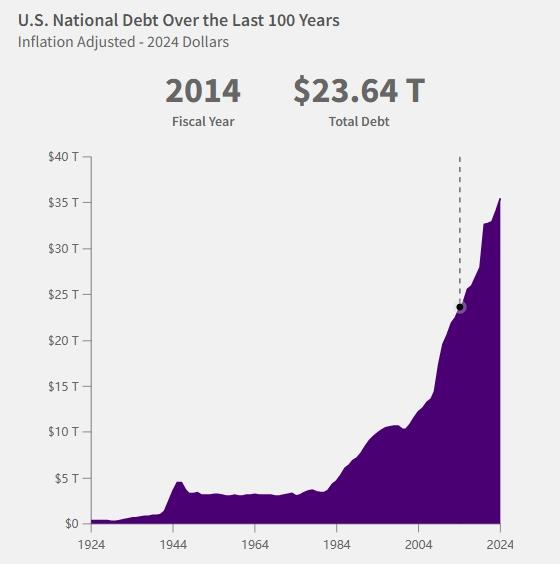△美國財政部下屬的財務(wù)數(shù)據(jù)網(wǎng)站披露的數(shù)據(jù)顯示,美國國債總額從2014年的23.64萬億美元升至2024年的超36萬億美元,漲幅超52%,這一趨勢整體上仍在持續(xù)加快。