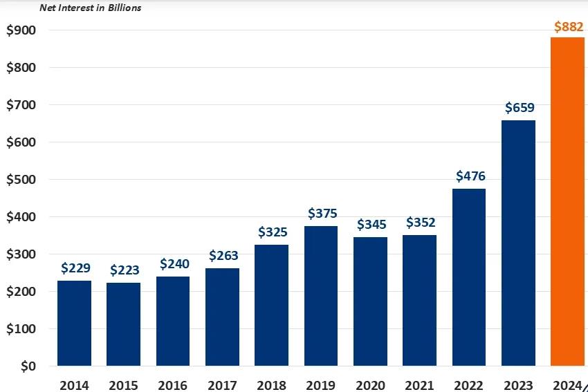 根據(jù)美國財政部11月20日公布的數(shù)據(jù),2024年美國聯(lián)邦政府僅用以償還美債利息的支出就達到了8820億美元。相較2023年6590億美元的利息支出,2024年美債利息支出增長率達33.8%。
