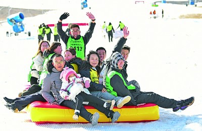 游客在內(nèi)蒙古烏蘭察布市大河灣滑雪場參加趣味冰雪運動。新華社發(fā)