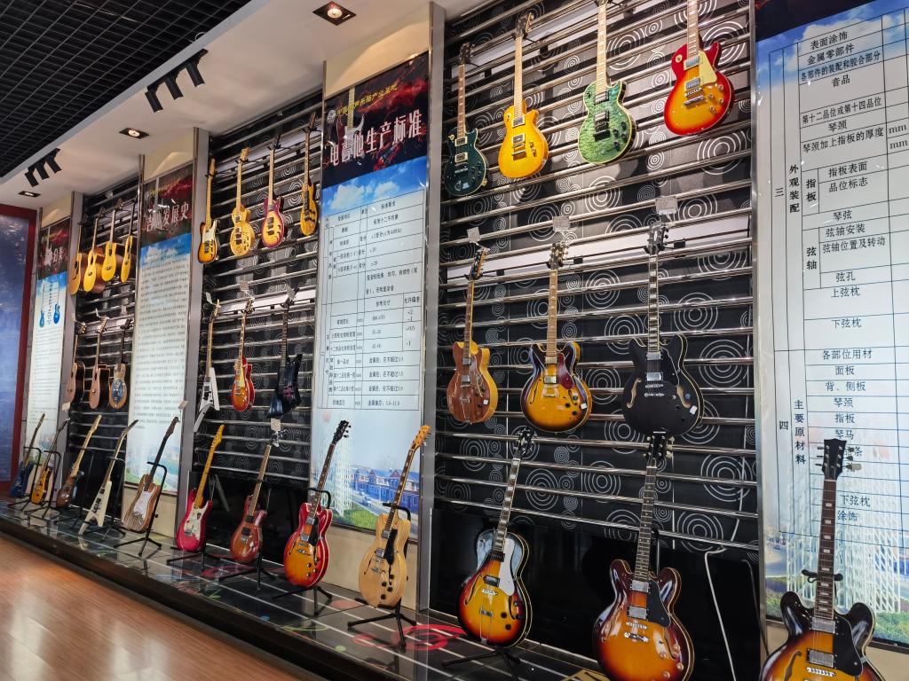 在鄌郚樂器產(chǎn)業(yè)發(fā)展中心,各式電吉他陳列其中。新華社記者 王志 攝